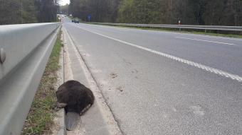 Pod wysokim nasypem znajduje się przepust rowu, bobry zatykają przepust i w konsekwencji nie maja jak przedostać się na drugą stronę drogi, z tego powodu wchodzą na nasyp. To jest drugi zabity bóbr w tym miejscu jakiego znalazłem.