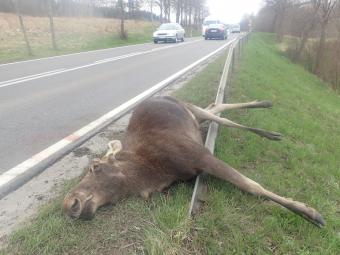 Nie było widać śladu wypadku, tzn kawałków części samochodowych czy szkła co sugeruje że zderzenie było z dużym autem, które nie zostało uszkodzone. Łoś jeszcze ciepły