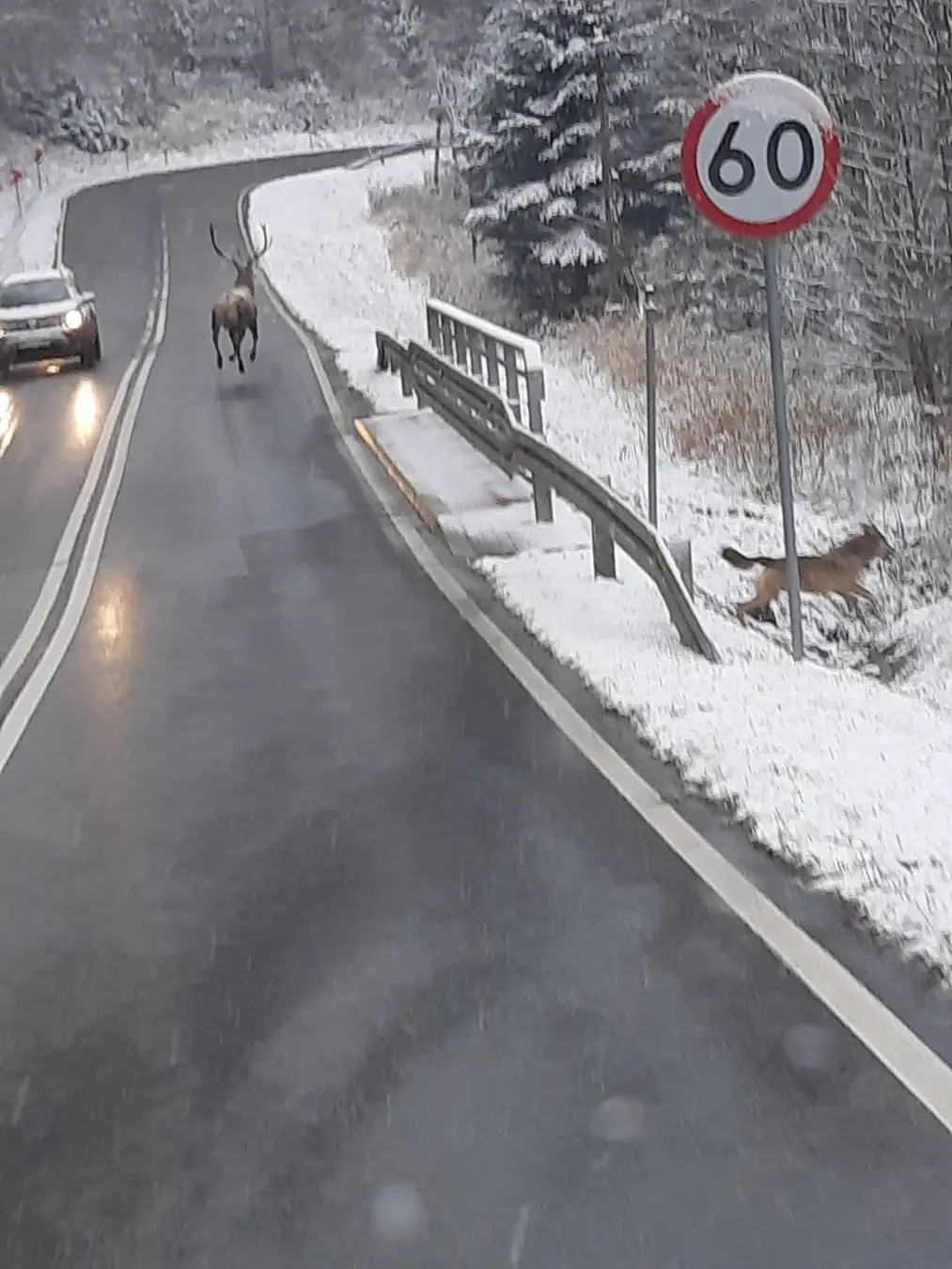 Polujący wilk na jelenia. Zdjęcie i opis ze strony internetowej. Informacja ze strony Nadleśnictwa Cisna-Lasy Państwowe