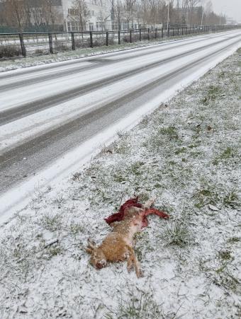Zając musiał zginąć kilka minut wcześniej. Obok największe osiedle w Opolu. Las parę kilometrów dalej. Przeniosłam zwierzę na pobocze.