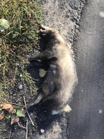 Zwierzę leżało na poboczu przy asfaltowej drodze powiatowej prowadzącej do Korfantowa, po prawej stronie, 50 m przed znakiem miejscowości. Równolegle do drogi pole z kukurydzą. Wielkość: około 60 cm długości.