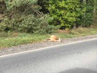 Pobocze drogi powiatowej, zwierzę (raczej młode) leżało na skraju drogi sąsiadującej z lasem. Zgłosiłem do WCZK w Opolu 24.09.2023 około godz. 9:50