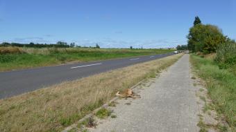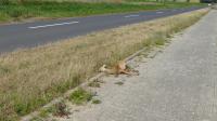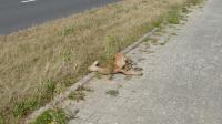 Zwłoki na ścieżce rowerowej i pasie zieleni oddzielającej ścieżkę od jezdni.