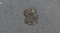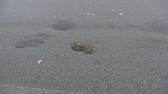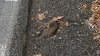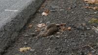 Dwa jeże w odległości ok. 10 m od siebie; dorosły i młody (wyraźnie mniejszy)