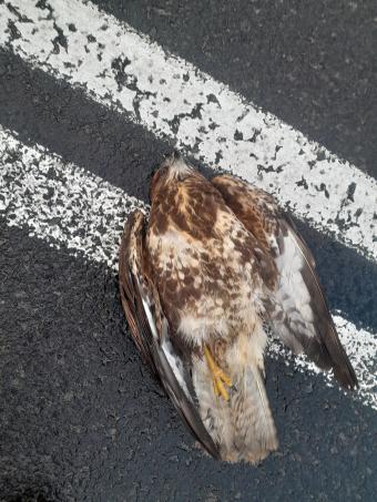 Ptak leżący na środku drogi. Po zatrzymaniu się celem dokonania dokumentacji okazało się, że jeszcze żył! Po zadzwonieniu na 112 przyjechała straż miejska z Lwówka Śląskiego i odwiozła go do weterynarza celem diagnozy.